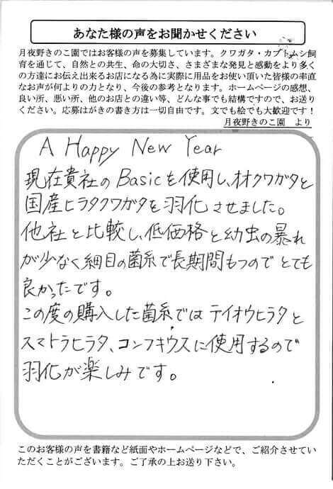 徳島県 箕浦 様 生体 X Facebook はてブ LINE Pinterest コピー 2016.01.12 A Happy New Year 現在貴社のBasicを使用し、オオクワガタと 国産ヒラタクワガタを羽化させました。 他社と比較し、低価格と幼虫の暴れ が少なく細目の菌糸で長時間もつのでとても 良かったです。 この度の購入した菌糸ではテイオウヒラタと スマトラヒラタ、コンフキウスに使用するので 羽化が楽しみです。