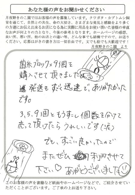 菌糸ブロック×9️個を購入させて頂きました。発送もすごく迅速で、ありがたかったです。3・5・9個ともうすこし個数を分けて売って頂けたらうれしいです(涙) でも、すっごい良かったのでまたぜひ利用させて下さい。ありがとうございました。