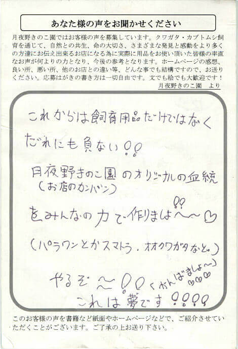 愛媛県 松原 様 生体 X Facebook はてブ LINE Pinterest コピー 2011.03.23 これからは飼育用品だけではなく だれにも負けない!! 月夜野きのこ園のオリジナルの血統 (お店のカンバン) をみんなの力で作りましょう!!~~ (パラワンとかスマトラ・オオクワガタなど。) やるぞ~!!「がんばりましょう~」 これは夢です!!!!