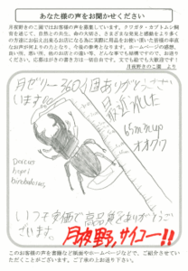 産卵初めてセットを購入しました。すべてセットになっているものはなかなかないので、とても助かりました。とてもわかりやすく説明もありました。しいていえば!!オスとメスは産卵初めてセットにずっと入れておくのか?交尾後のメスだけの方がいいのか?2人仲良くの方がいいのか?幼虫を菌糸ビンに入れる時は「別紙参照」とかワンポイントアドバイスのようなものを書いてくださると初心者にはうれしいです!