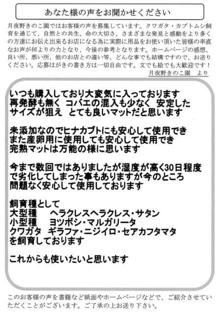 いつも購入しており大変気に入っております。再発酵も無く、コバエの混入も少なく安定したサイズが狙え、とても良いマットだと思います。未添加なのでヒナカブトにも安心して使用でき、また産卵用に使用しても安心して使用でき、完熟マットは万能の様に思います。今まで数回ではありましたが湿度が高く30日程度で劣化してしまった事もありますが今のところ問題なく安心して使用しております。
