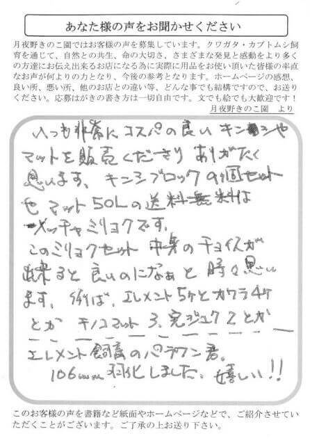 愛知県 吉田 様 発酵Mat X Facebook はてブ LINE Pinterest コピー 2019.08.24 いつも非常にコスパの良いキンシやマットを販売くださりありがたく思います。キンシブロック9個セットやマット50Lの送料無料はメッチャミリョクです。このミリョウセット中身のチョイスが出来ると良いのになぁと時々思います。