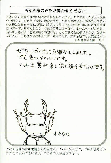 愛知県 山下 様 イラスト X Facebook はてブ LINE Pinterest コピー 2011.05.16 ゼリーがっけこう液ダレしました。 でも食いがいいです。 マットは質が良く使い勝手がいいです。 【月夜野きのこ園】より 今後とも改良できるよう努力して行きます。 どうぞ宜しくお願い申し上げます。