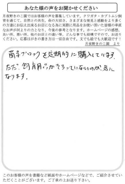 愛知県 横井 様 菌糸ブロック X Facebook はてブ LINE Pinterest コピー 2021.02.042025.12.17 菌糸ブロックを定期的に購入しています。ただ飼育用品がそろっていないのが気になります。