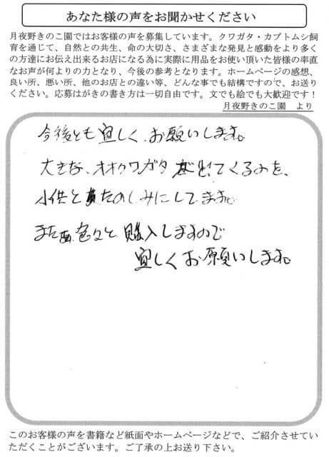 愛知県 永吉 様 ご意見・ご感想区分 X Facebook はてブ LINE Pinterest コピー 2020.04.182025.12.17 大きなオオクワガタが出てくるのを子供とたのしみにしてます。