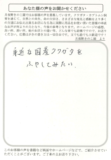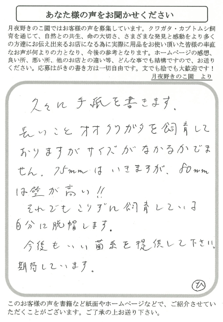 今年初めてクワガタの産卵をやってみました。天然のオオクワガタメスをつかまえて、いろいろとホームページや動画を参考に育てております。そんな中、きのこ園さんの菌糸が目にとまり初めて購入させていただきました。良さそうな感じはするので愛用したいと思います。これからもよろしくお願いします。