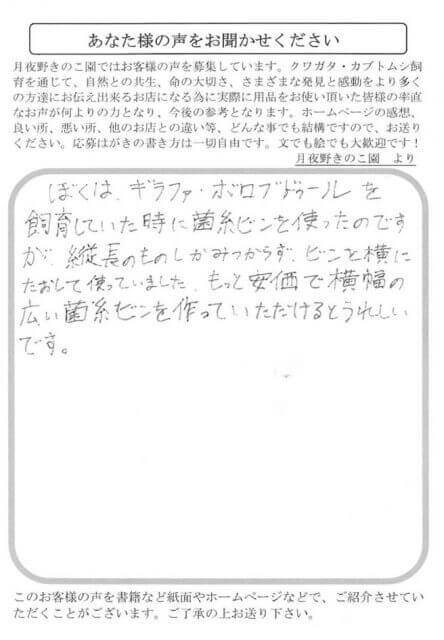 愛知県 牧 様 菌糸ビン X Facebook はてブ LINE Pinterest コピー 2019.08.29 ぼくはギラファ・ボロブドゥールを飼育していた時に菌糸ビンを使ったのですが、縦長のものしかみつからず、ビンと横にたおして使っていました。もっと安価で横幅の広い菌糸ビンを作っていただけるとうれしいです。
