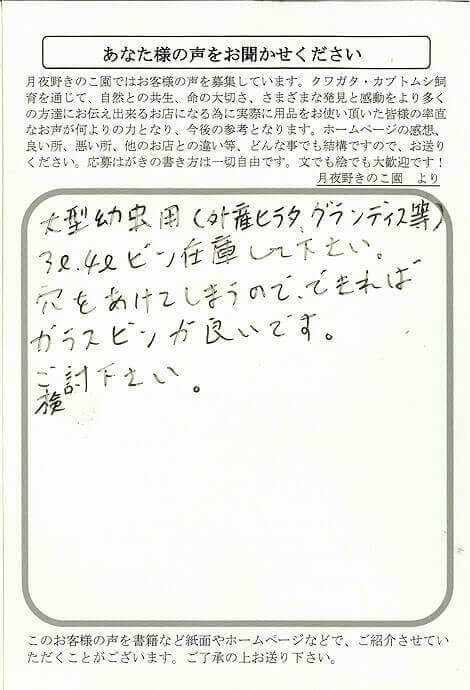 愛知県 高橋 様 40代 X Facebook はてブ LINE Pinterest コピー 2013.09.13 大型幼虫用(外産ヒラタ、グランディス等) 3l、4lビン在庫して下さい。 穴をあけてしまうので、できれば ガラスビンが良いです。 ご検討ください。