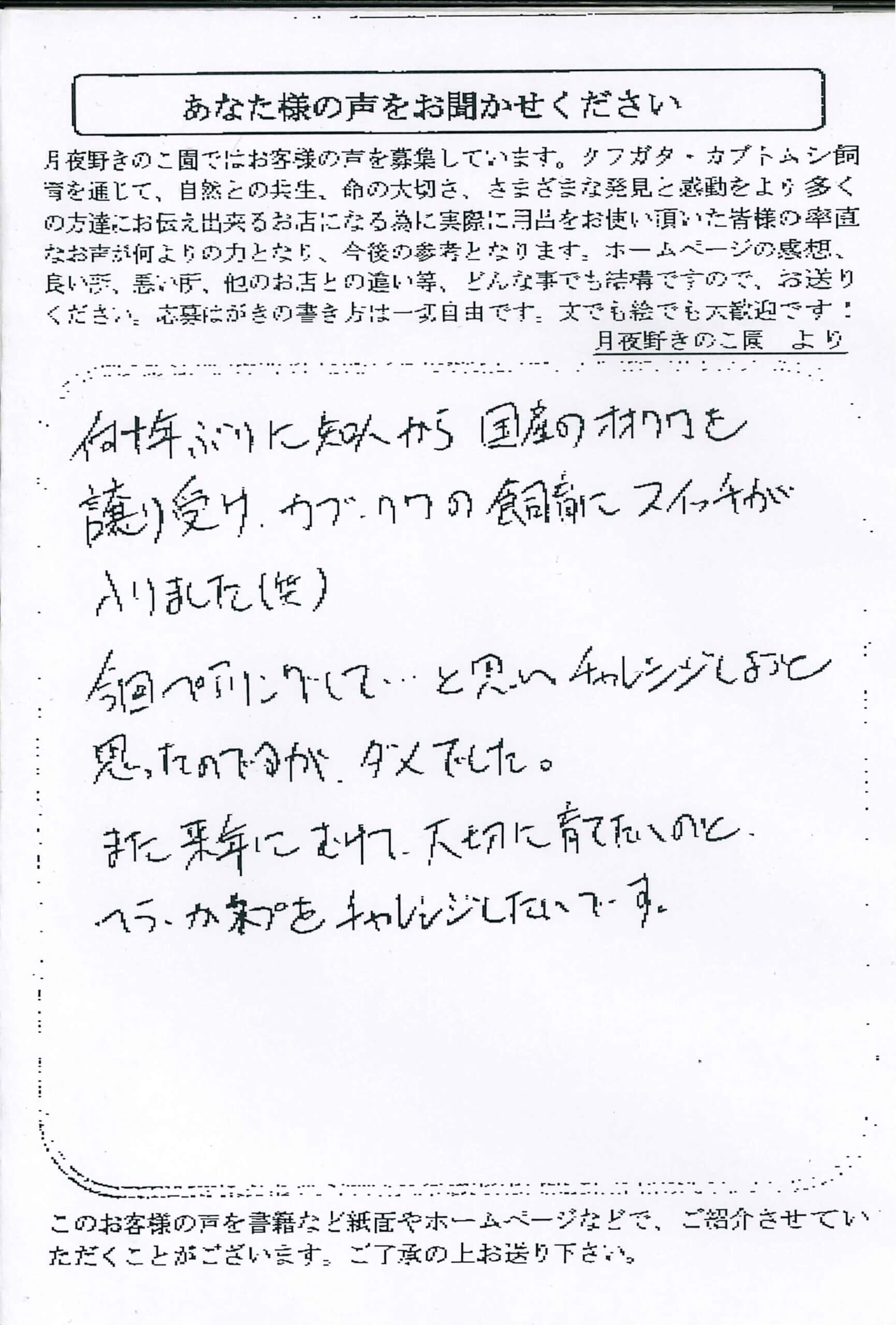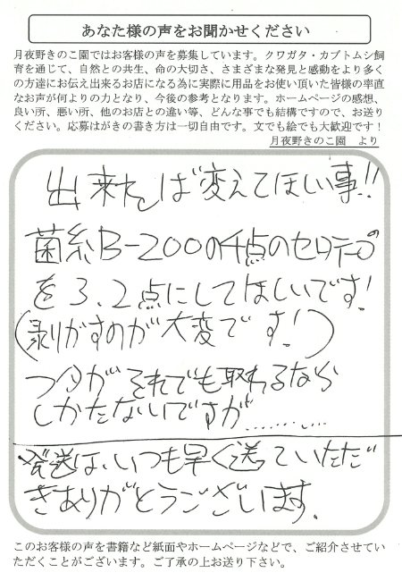 新潟県 俵山 様 対応 X Facebook はてブ LINE Pinterest コピー 2025.10.182025.12.15 出来れば変えてほしい事!!菌糸B-200の4点のセロテープを3.2点にしてほしいです!(剥がすのが大変です!)フタがそれでもとれるならしかたないですが…発送は、いつも早く送っていただきありがとうございます。