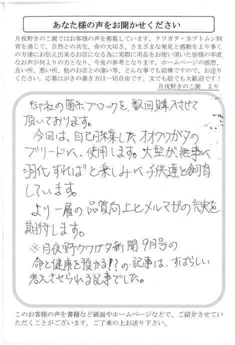 新潟県 古田 様 菌糸ブロック X Facebook はてブ LINE Pinterest コピー 2017.09.13 御社の菌糸ブロックを、数回購入させて頂いております。今回は自己採集したオオクワガタのブリードに使用します。大型が無事に羽化すればと楽しみにこどもたちと飼育しています。 より一層の品質向上とメルマガの充実を期待します。※月夜野クワガタ新聞9月号の命と健康を預かる!?の記事は、すばらしい考えさせられる記事でした。