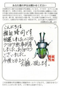 東京都 奥野 様 2025 12/17 生体 40代 2021年4月14日2025年12月17日 はじめまして。今まで何十年もセミ(世界のセミ)を追いかけていましたが、クワガタの魅力に取り憑かれてしまいました。…これから貴社にお世話になると思います。 生体 40代 よかったらシェアしてね! URLをコピーしました! URLをコピーしました! 千葉県 坂倉 様 静岡県 渡辺 様 おすすめ記事 てすと投稿です。 2025年12月23日 東京都 澤井 様 2025年12月17日 千葉県 平野 様 2025年12月15日 群馬県 はやしかわ 様 2025年11月21日 群馬県 はやしかわ 様 2025年11月21日 奈良県 栗原 様 2025年11月21日 群馬県 鈴木 様 2025年11月21日 大阪府 ささべ 様 2025年11月21日