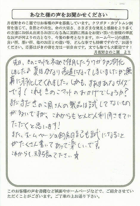 東京都 小島 様 きのこMat X Facebook はてブ LINE Pinterest コピー 2013.11.27 先日、きのこマットを初めて使用したクワガタが羽化 しました♪夏はかなり高温になってしまいましたが無 事に羽化してくれました。しかも、まあまあなサイズ です!これもきのこマットのおかげでしょうか? まだまだきのこ園さんの製品は試してないもの が多いですが、これからもどんどん利用させてい ただくと思います! また、ホームページの飼育日記も試になること がたくさん書いてあって楽しいです。 これからも、頑張って下さい☆