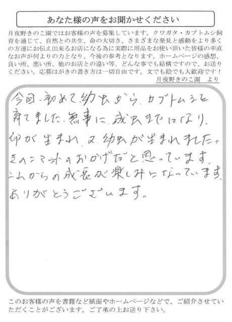 今回、初めて幼虫からカブトムシを育てました。無事に成虫までになり、卵が生まれ又、幼虫が生まれました。きのこマットのおかげだと思ってます。これからの成長が楽しみになっています。ありがとうございました。