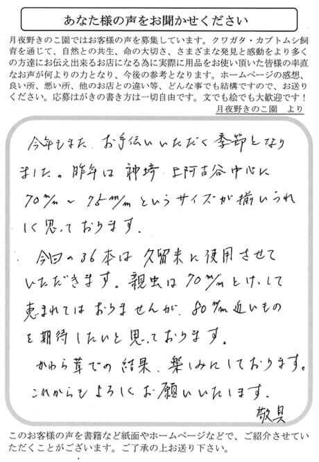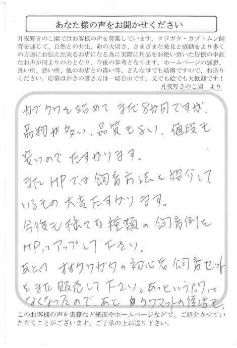 東京都 小野口 様 10代 X Facebook はてブ LINE Pinterest コピー 2018.03.14 カブクワを初めてまだ8か月ですが、品物が多い、品質もよい、値段も安いのでたすかります。またHPでは飼育方法を紹介しているのも大変たすかります。今後も様々な種類の飼育例をHPにアップして下さい。あとはオオクワガタの初心者飼育セットをまた販売して下さい。あっという間になくなったので、あとクワマットの復活も