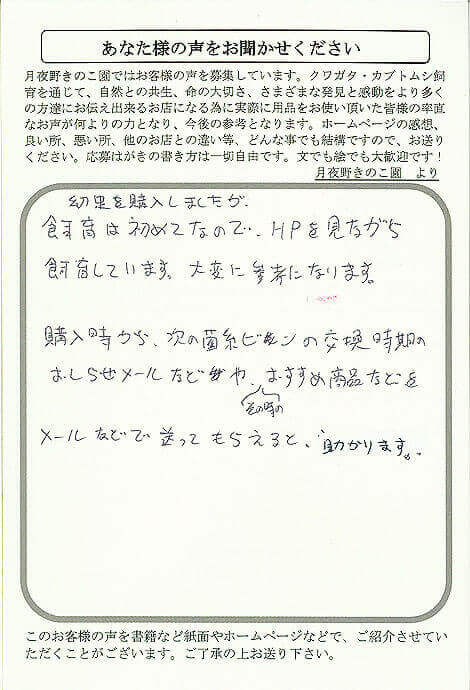 東京都 山岸 様 ホームページ X Facebook はてブ LINE Pinterest コピー 2013.11.18 幼虫を購入しましたが、 飼育は初めてなので、HPを見ながら 飼育しています。大変に参考になります。 購入時から、次の菌糸ビンの交換時期の おしらせメールなどや、その時のおすすめ商品などを メールなどで送ってもらえると、助かります。