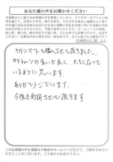東京都 岡村 様 きのこMat X Facebook はてブ LINE Pinterest コピー 2019.05.09 きのこマットを購入させて頂きました。カブトムシの食いが良く、大きくなっているように思います。ありがとうございます。今後も利用させて頂きます。