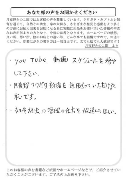 東京都 岡田 様 対応 X Facebook はてブ LINE Pinterest コピー 2021.10.142025.12.17 ・you Tube動画スケジュールを増やして下さい。 ・月夜野クワガタ新聞を毎月送っていただけると幸いです。 ・初令幼虫の管理の仕方を放送してほしい。