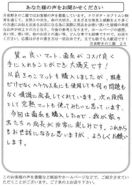 質の良いマット・菌糸がコスパ良く手に入れることができ大満足です!以前きのこマットを購入しましたが、国産だけではなくヘラクレス系にも使用しても何も問題なく順調に成長してくれています。次の段階として、完熟マットも使ってみたいと思っています。今回は菌糸を購入したので、我が家の虫たちの成長が非常に楽しみです。これからもお世話になると思いますが、よろしくお願いします。