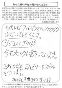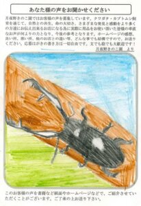 いままで飼育をやめていて、2年位前からまた飼育をはじめました。ホペイに興味がありホペイしか飼育していませんが、最近カブト虫にも興味が出てきて飼育してみようと思ってます。飼育をやめる前も今も月夜野きのこ園にお世話になってますが、これからもお世話になります。クワガタはBasicブロックを使ってますが、カブトはきのこマットでがんばります。これからも安くて良い飼育用品いっぱい出して下さい。よろしくお願いします。