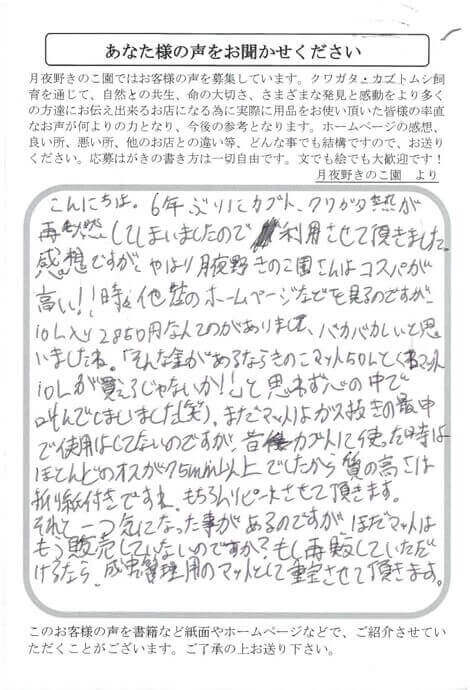 感想ですが、やはり月夜野きのこ園さんはコスパが高い!!時々他店のホームページなどを見るのですが、10L入り2850円なんてのがありまして、バカバカしいと思いましたね、「そんな金があるならきのこマット50Lとくわマット10Lが買えるじゃないか!!」と思わず心の中で叫んでしまいました(笑)。