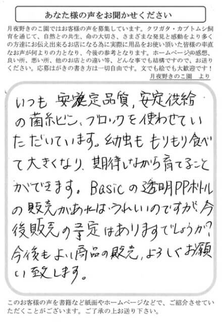 いつも安定品質、安定供給の菌糸ビン・ブロックを使わせていただいています。幼虫ももりもり食べて大きくなり、期待しながら育てることができます。Basicの透明PPボトルの販売があればうれしいのですが、今後販売の予定はありますでしょうか?今後もよい商品の販売、よろしくお願い致します。