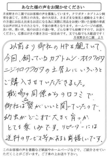 以前より御社のHPを観ていて、今回飼っているカブトムシ・オオクワガタ・ニジイロクワガタの土替えにいろいろとご購入させて頂きました。職場の同僚からの口コミで御社は品質がいいと聞いていたので、幼虫がどこまで大きく育つかとても楽しみです。リピーターには送料のサービス等があると尚嬉しいです。