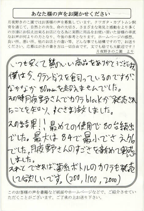 それと できれば、菌糸ボトルのカワラも発売して欲しいです。