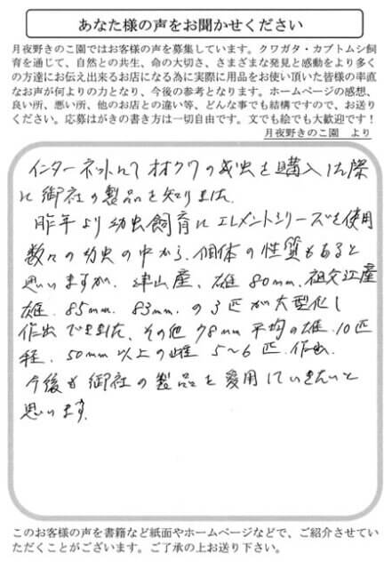 インターネットにてオオクワの成虫を購入した際に御社の製品を知りました。昨年より幼虫飼育にエレメントシリーズを使用。数々の幼虫に中から個体の性質もあると思いますが、津山産:雄80mm、祖父江産:雄85mm・83mmの3匹が大型化し、作出できました。その他:78mm平均の雄10匹程、50mm以上の雌5~6匹作出、今後とも御社の製品を愛用していきたいと思います。