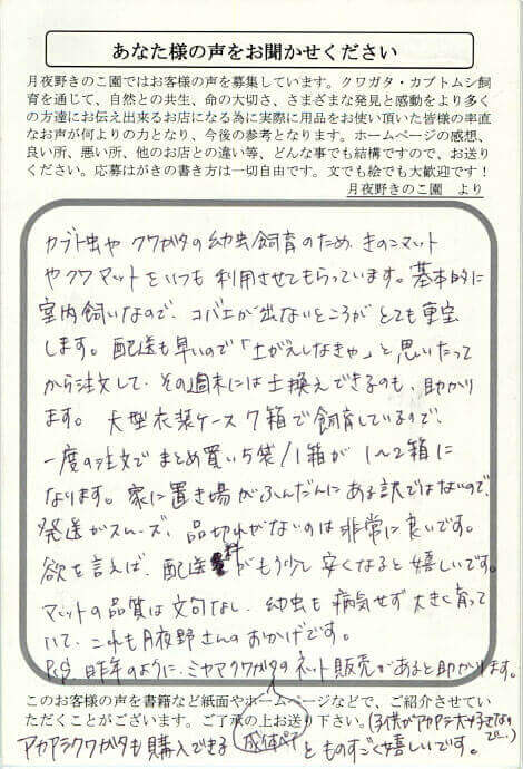 マットの品質は文句なし、幼虫も病気せず大きく育って