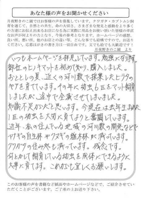 いつもホームページを拝見しています。勉強になります。御社のヒノキマットを初めて知り、購入しました。おととしの夏、近くの河川敷で採取したヒラタのペアを育てています。その年に幼虫6匹をマット飼育しましたが、途中で全滅させてしまいました。知識不足からだと思います。今現在は去年生まれた1匹の幼虫を大切に育てようと奮闘しています。近年、私の住んでいる地域の河川敷の開発などで、ヤナギの自生林やクヌギの雑木林が減っています。クワガタの住み処も減っています。残念です。何とかして飼育している幼虫を成体にできるように大事に育てます。これからも宜しくお願いいます。