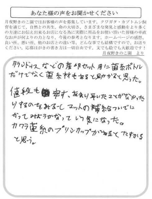 栃木県 山口 様 2019 11/13 N1100 10代 2019年11月13日 タランドゥスなどの産卵セット用に菌糸ボトルだけでなく菌糸材もあると助かると思った。値段も安す聞いたことがなかったりするのをみると、マットの補給ついでにかってみようかなっていう気になった。カワラ菌糸のプリンカップがあるとたすかると思う。 N1100 10代 よかったらシェアしてね! URLをコピーしました! URLをコピーしました! 鳥取県 市村 様 宮崎県 井戸川 様 おすすめ記事 てすと投稿です。 2025年12月23日 東京都 澤井 様 2025年12月17日 千葉県 平野 様 2025年12月15日 群馬県 はやしかわ 様 2025年11月21日 群馬県 はやしかわ 様 2025年11月21日 奈良県 栗原 様 2025年11月21日 群馬県 鈴木 様 2025年11月21日 大阪府 ささべ 様 2025年11月21日