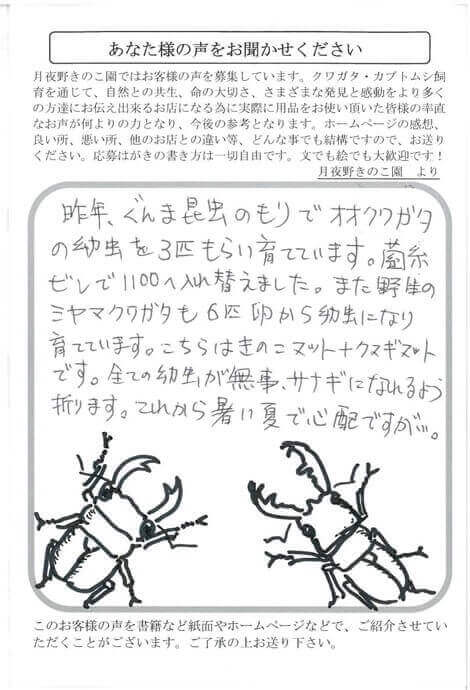 栃木県 稲葉 様 40代 X Facebook はてブ LINE Pinterest コピー 2018.05.23 昨年ぐんま昆虫のもりでオオクワガタの幼虫を3匹もらい育てています。菌糸ビンで1100へ入れ替えました。また野生のミヤマクワガタも6匹卵から幼虫になり育てています。こちらはきのこマット+クヌギマットです。全ての幼虫が無事サナギになれるよう祈ります。これから暑い夏で心配ですが…