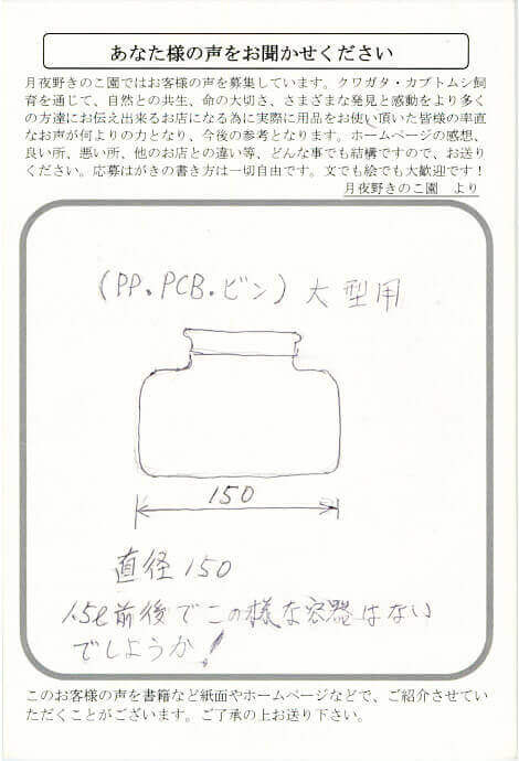 栃木県 高橋 様 その他 X Facebook はてブ LINE Pinterest コピー 2011.03.29 (PP.PCB.ビン)大型用 直径150 1.5ℓ前後でこの様な容器はないでしょうか! 【月夜野きのこ園】より 今後、仕入ルートを検索し、取扱商品として検討をさせて頂きます。 どうぞ宜しくお願い申し上げます。