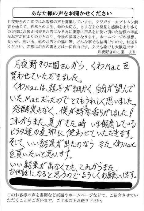 沖縄県 玉村 様 くわMat X Facebook はてブ LINE Pinterest コピー 2015.01.07 月夜野きのこ園さんから、くわMatを 買わせていただきました。 くわMatは、粒子が細かく、自分が望んで いたMatだったのでとてもうれしく思いました。 発酵臭もなく、僕が好きな香りがしました! これからまた、夏がきた時 いま飼育している ヒラタ達の産卵に使わせていただきます。 そして、いい結果が出たのならまた くわMat を買いたいtと思います。 いい結果が出なくても、これからまた お世話になると思うのでよろしくお願いします。