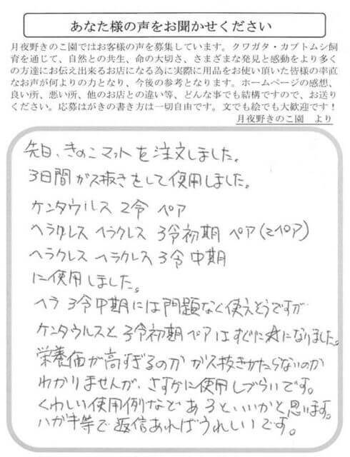 滋賀県 小斉 様 きのこMat X Facebook はてブ LINE Pinterest コピー 2019.11.20 先日、きのこマットを注文しました。3日間ガス抜きをして使用しました。・・・・・ ・・・・・くわしい使用例などあるといいかと思います。ハガキ等で返信あればうれしいです。