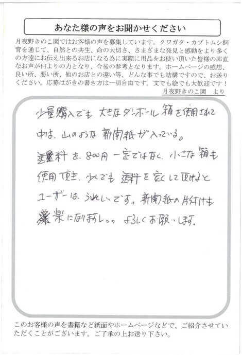 滋賀県 青山 様 50代 X Facebook はてブ LINE Pinterest コピー 2017.07.26 少量購入でも大きなダンボール箱を使用されて 中は山のような新聞紙が入っている。 送料を800円一定ではなく小さな箱も使用頂き、 少しでも送料を安くして頂けるとユーザーはうれしいです。 新聞紙の片付けも楽になりますし。。 よろしくお願いします。