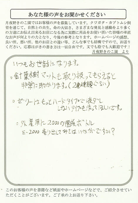 滋賀県 高田 様 取扱追加希望 X Facebook はてブ LINE Pinterest コピー 2011.08.11 いつもお世話になります。 ○針葉樹マットも取り扱ってもらえると 非常に助かります(2種類ぐらい) ○ゼリーはもっとハードタイプで液ダレ しないタイプも作ってほしいです。 ○外産用に2000の菌糸ボトルE-2000 売り出してみてはいかがですか?