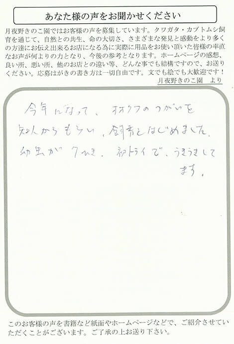 熊本県 吉村 様 その他 X Facebook はてブ LINE Pinterest コピー 2012.08.06 今年になって、オオクワのつがいを 知人からもらい、飼育をはじめました。 幼虫7ひき、初トライでうきうきしてます。