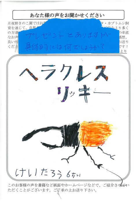 プレゼントは月ごとに替わります。内容はマットや菌糸ビン、オオクワの幼虫などになります。