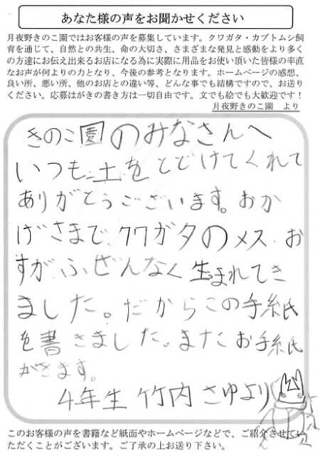 熊本県 竹内 様 発酵Mat X Facebook はてブ LINE Pinterest コピー 2022.09.282025.12.16 いつも土をとどけてくれてありがとうございます。おかげさまで、クワガタのメス・おすがふぜんなく生まれてきました。だからこの手紙を書きました。またお手紙かきます。