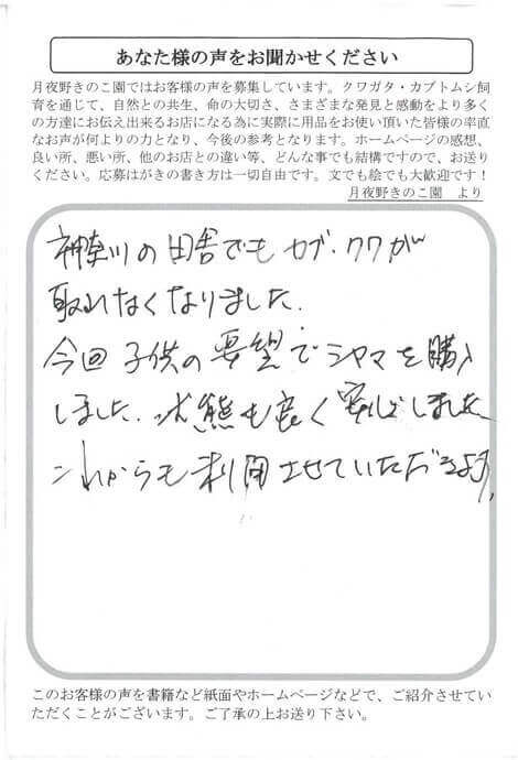 神奈川県 一柳 様 生体 X Facebook はてブ LINE Pinterest コピー 2017.08.09 神奈川の田舎でもカブ・クワが取れなくなりました。 今回子供の要望でミヤマを購入しました。 状態もよく安心しました。 これからも利用させていただきます。