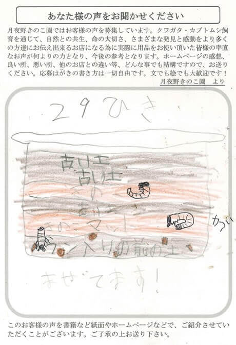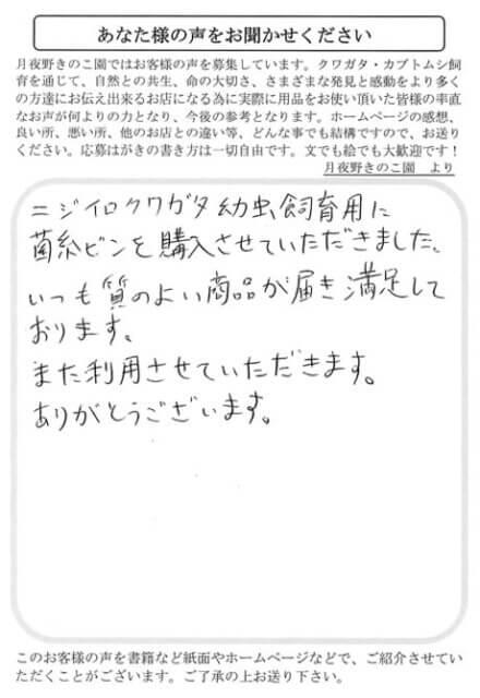 神奈川県 中村 様 菌糸ビン X Facebook はてブ LINE Pinterest コピー 2024.02.282025.12.15 ニジイロクワガタ幼虫飼育用に菌糸ビンを購入させていただきました。いつも質のよい商品が届き満足しております。また利用させていただきます。ありがとうございます。