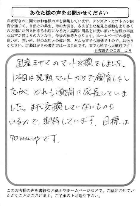 神奈川県 井口 様 完熟Mat X Facebook はてブ LINE Pinterest コピー 2015.01.07 国産ミヤマのマット交換をしました。 1本目は完熟マットだけで飼育しまし たが、どれも順調に成長していま した。まだ交換していないものも いるので、期待しています。目標は 70mmUPです。
