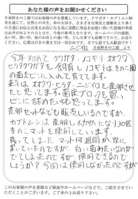 今年初めてクワガタ・ノコギリ・オオクワ・ヒラタクワガタを飼育し、ノコギリはきのこ園の菌糸ビンに入れて育ててます。来年は、オオクワ・ヒラタ・ニジイロを産卵させたいと思ってます。菌床ブロックを買いビンに詰めたいとも思ってます。産卵セットなども販売しているのですか。カブトムシは産卵し幼虫になり30匹きのこマットを使用しています。残ってしまったマット何週間か家に置いていたのですが、白い菌みたいなのがでてしまったのですが使用できるのでしょうか。今回は使用しなかったのですが。