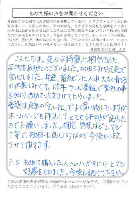 神奈川県 宗像 様 菌糸ビン X Facebook はてブ LINE Pinterest コピー 2019.01.30 こんにちは。先日は綺麗に梱包された品物をありがとうございました。幼虫もみな元気で安心しました。早速、菌糸ビンに入れ大きく育てるのが楽しみです。昨年、テレビ番組で貴社の事を知り、初めて注文させてもらいました。普段は東京の「むし社」でよく買い物していますが、ホームページを拝見してとても評判が良かったのでお願いしました。梱包・包装などとても丁寧で価格も良心的なので今後も注文させて頂きます。 P.S 初めて購入した人へのハガキにはとても好感をもちました。今後も続けて下さい。