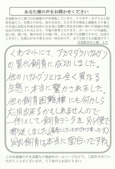 神奈川県 小山 様 くわMat X Facebook はてブ LINE Pinterest コピー 2012.03.31 くわマットにて、アカマダラハナムグリの 累代飼育に成功しました。 他のハナムグリとは全く異なる 生態に本当に驚かされました。 他の飼育困難種にも何かしら 応用出来るかもしれませんので 一例として飼育データを別便で 郵送しました。(参考にしていただけたら幸いです。) 昆虫飼育は本当に面白いですね。 【月夜野きのこ園】より アカマダラハナムグリデータ ↓↓↓↓ 産卵レポート 飼育レポート