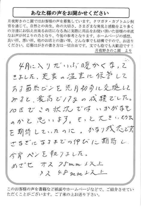 神奈川県 山下 様 菌糸ビン X Facebook はてブ LINE Pinterest コピー 2014.04.08 4月に入りだいぶ暖かくなって きました。実家の温室に保管して ある菌糸ビンを先月初句にこうかんして みると、最高で17gの成績でした。 10匹でこの状況ではいかがなも のかと思います。もっと大きい幼虫 を期待していたのに。かなり残念です。 さなぎになるまでの伸びに期待し 今宵ペンを執りました。 めざせ オス 75mm以上 メス 48mm以上