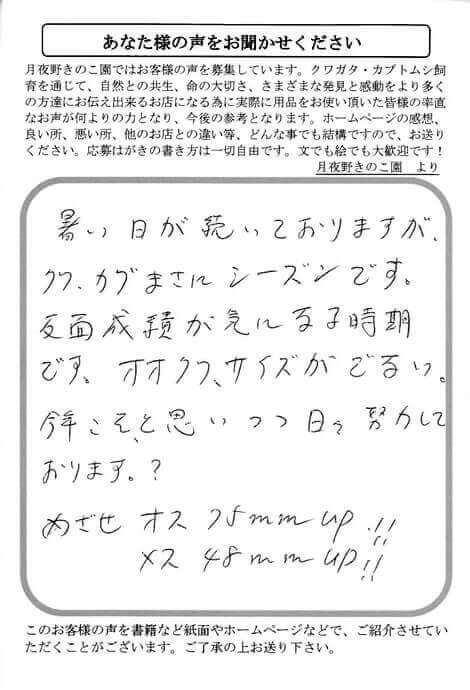 神奈川県 山下 様 生体 X Facebook はてブ LINE Pinterest コピー 2014.08.07 暑い日が続いておりますが、 クワ、カブまさにシーズンです。 反面成績が気になる時期 です。オオクワサイズがでる 今年こそと思いつつ日々努力して おります。 めざせオス75mmUP!! メス48mmUP!!