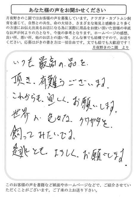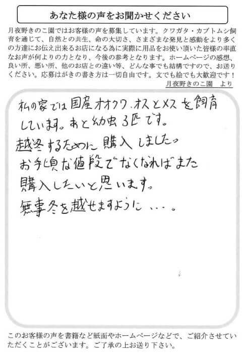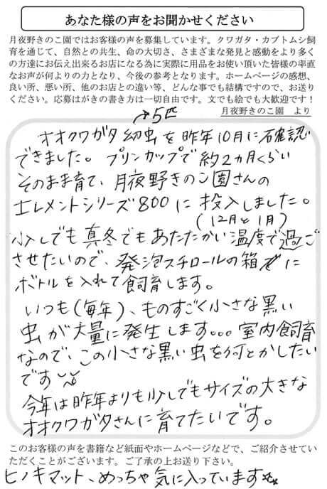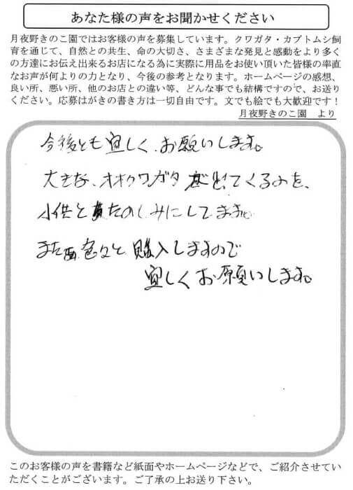 子どもがカブトムシを知人からもらい、その時の興奮している姿から苦手だった私も飼育を決意しました。いざ、飼育を始めてみると私の方がのめり込んでしまい色々調べていくようになりました。今では、子どもの友達に配ったり、飼い方を伝えたりできるようになりたいなと目標もできました。色々な事を実践しながら子どもの笑顔をカブトムシ・クワガタの成長を楽しみたいと思います。