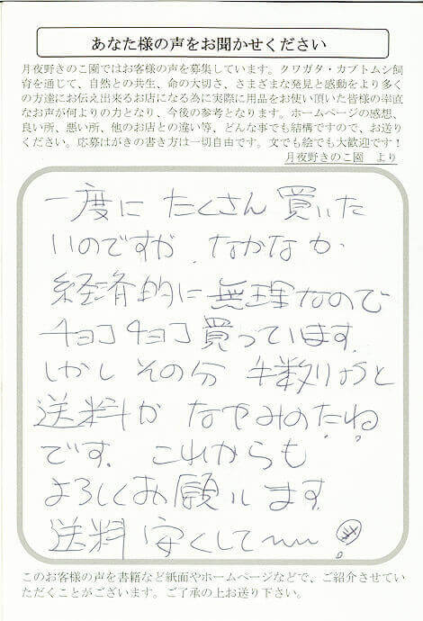 神奈川県 渡刈 様 その他 X Facebook はてブ LINE Pinterest コピー 2013.03.21 一度にたくさん買いたいのですがなかなか経済的に無理なのでチョコチョコ買っています。しかしその分手数りょうと送料がなやみのたねです。これからもよろしくお願いします。送料安くして~~!